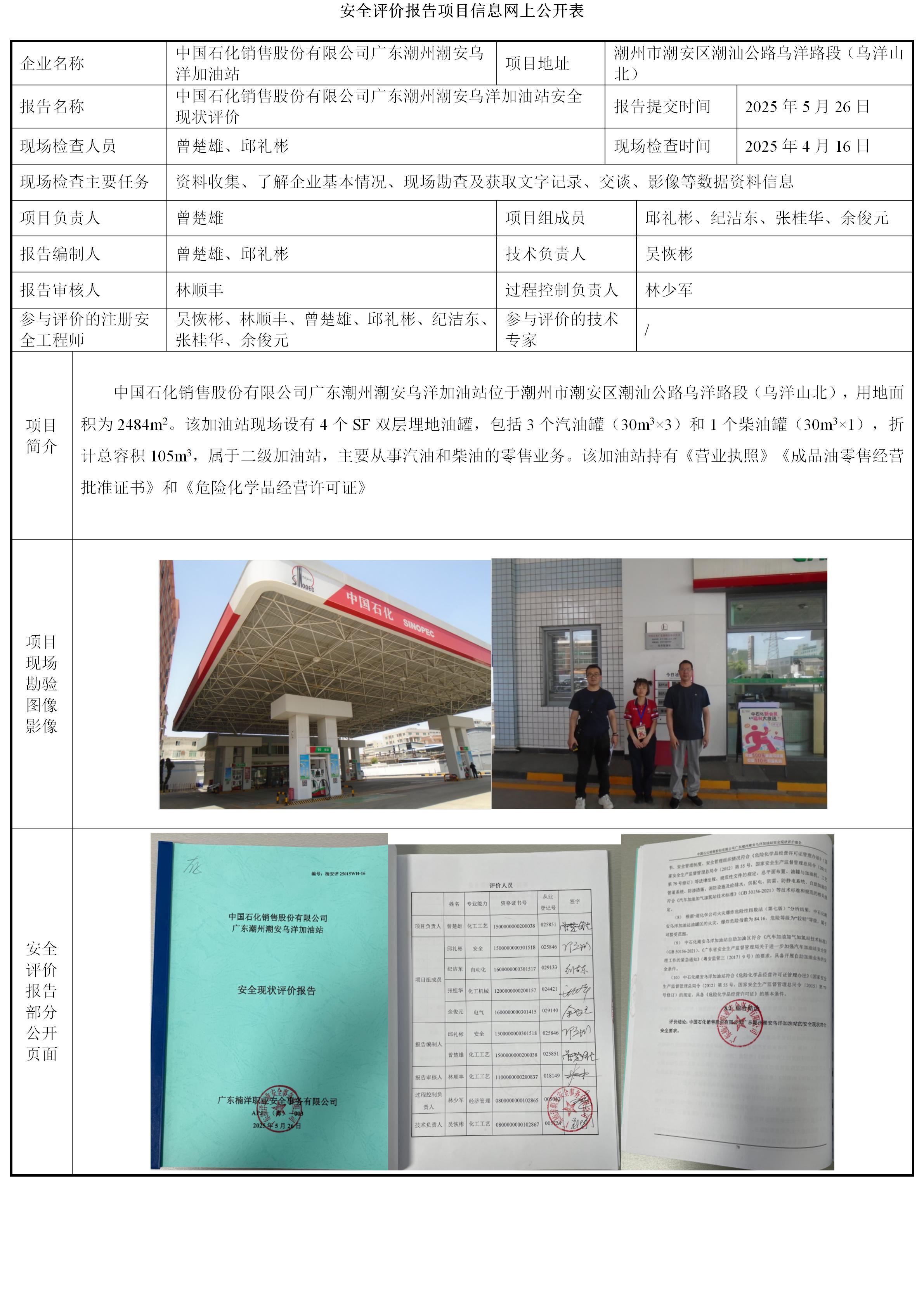 中国石化销售股份有限公司广东潮州潮安乌洋加油站安全现状评价