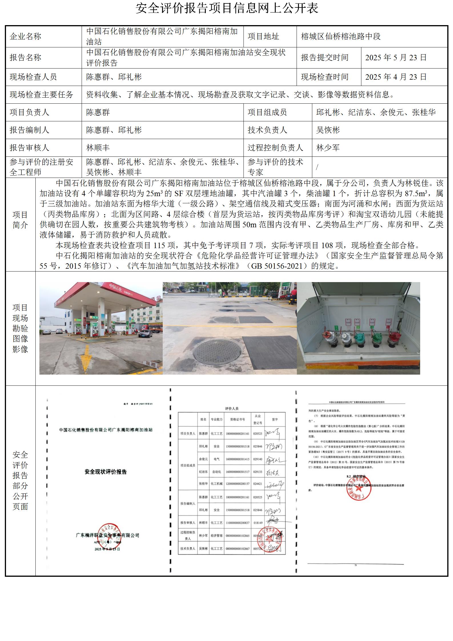 中国石化销售股份有限公司广东揭阳榕南加油站安全现状评价报告