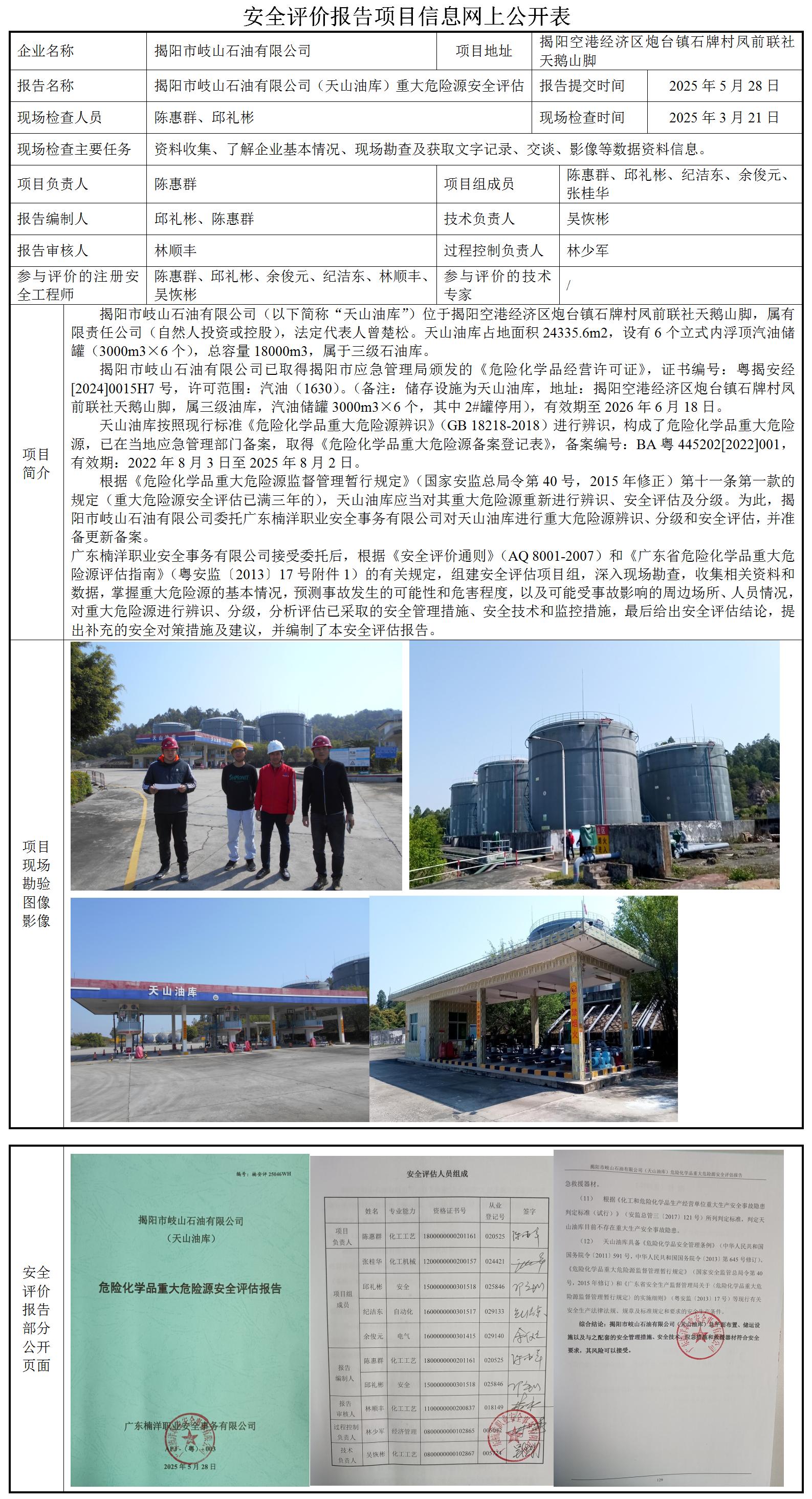 揭阳市岐山石油有限公司(天山油库)危险化学品重大危险源安全评估