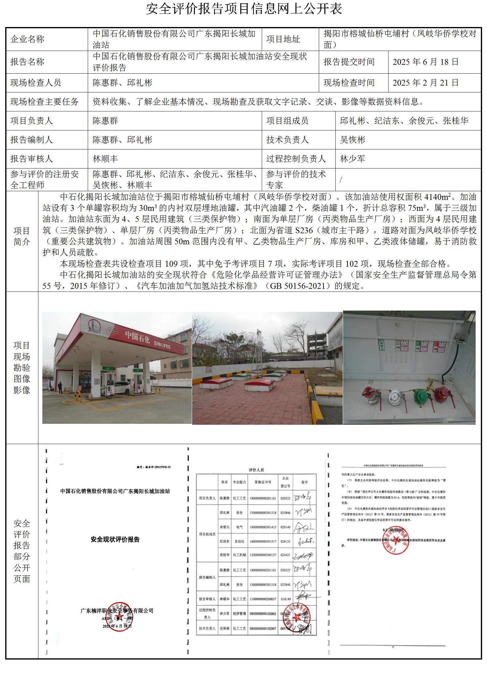 中国石化销售股份有限公司广东揭阳长城加油站安全现状评价