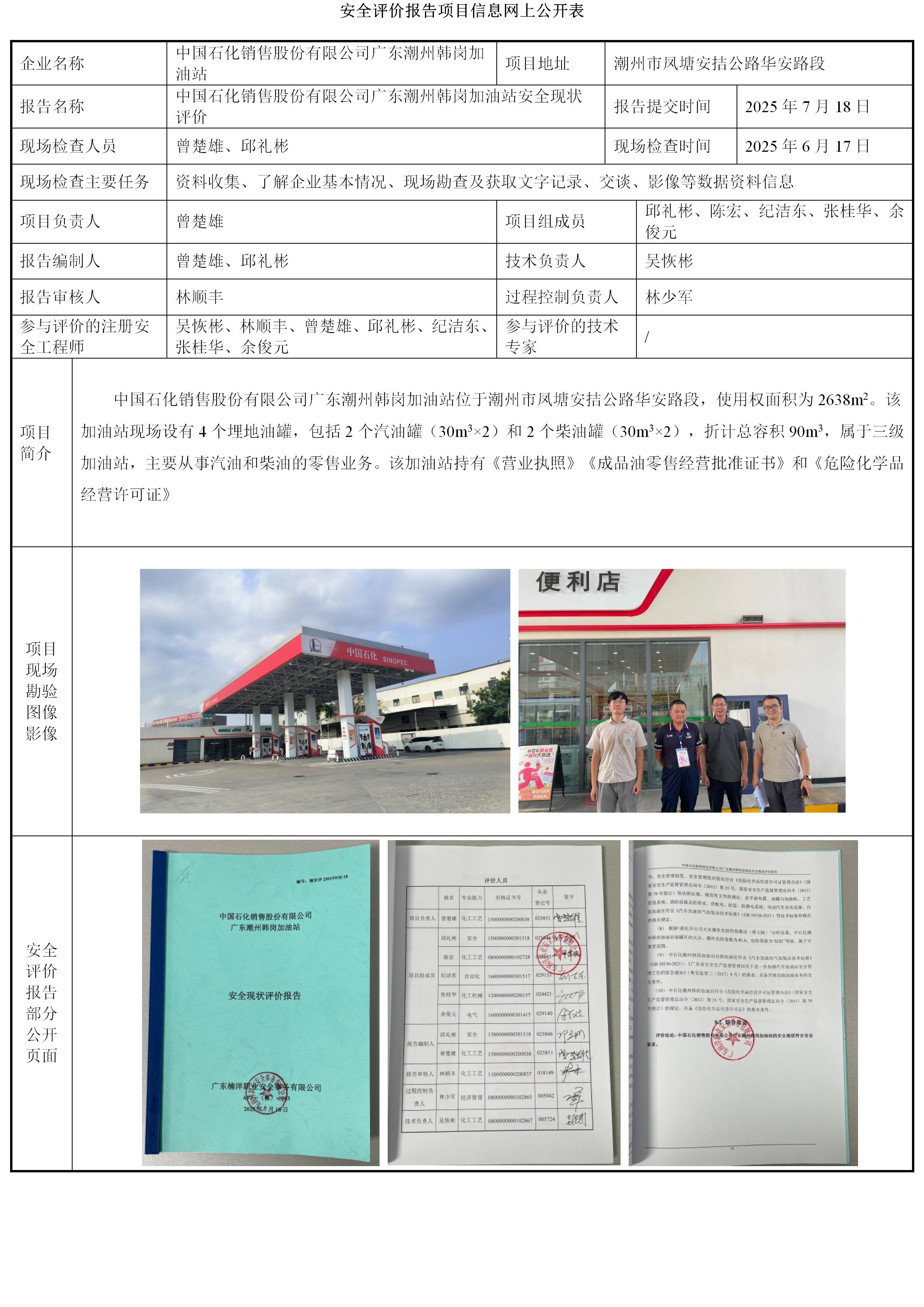 中国石化销售股份有限公司广东潮州韩岗加油站安全现状评价