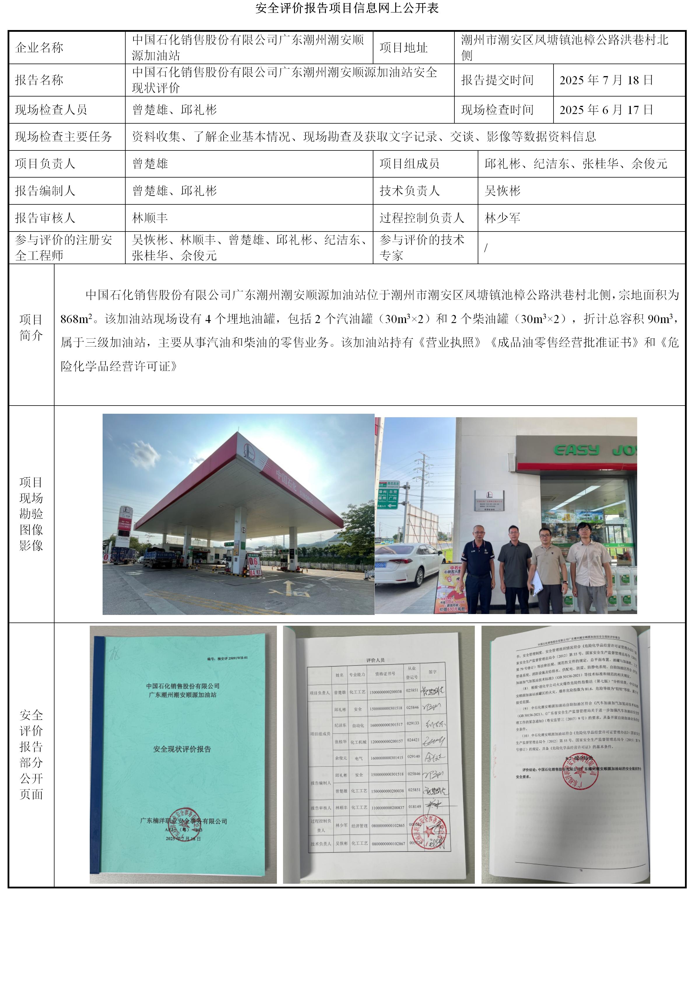中国石化销售股份有限公司广东潮州潮安顺源加油站安全现状评价