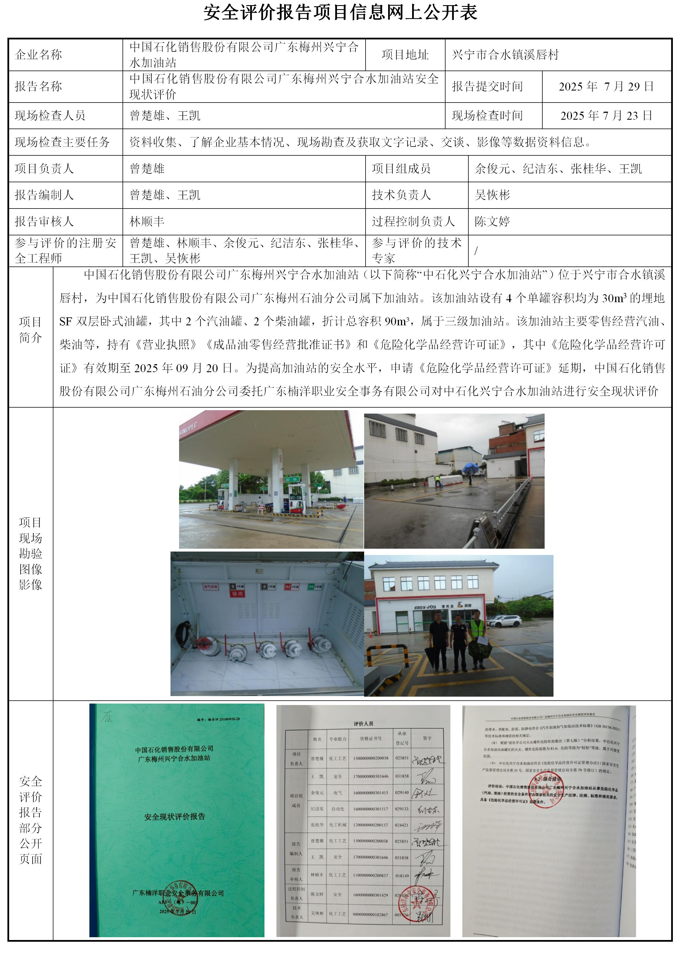 中国石化销售股份有限公司广东梅州兴宁合水加油站安全现状评价