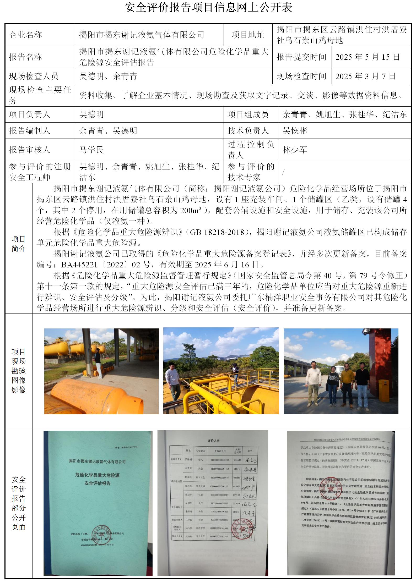 揭阳市揭东谢记液氨气体有限公司危险化学品重大危险源安全评估