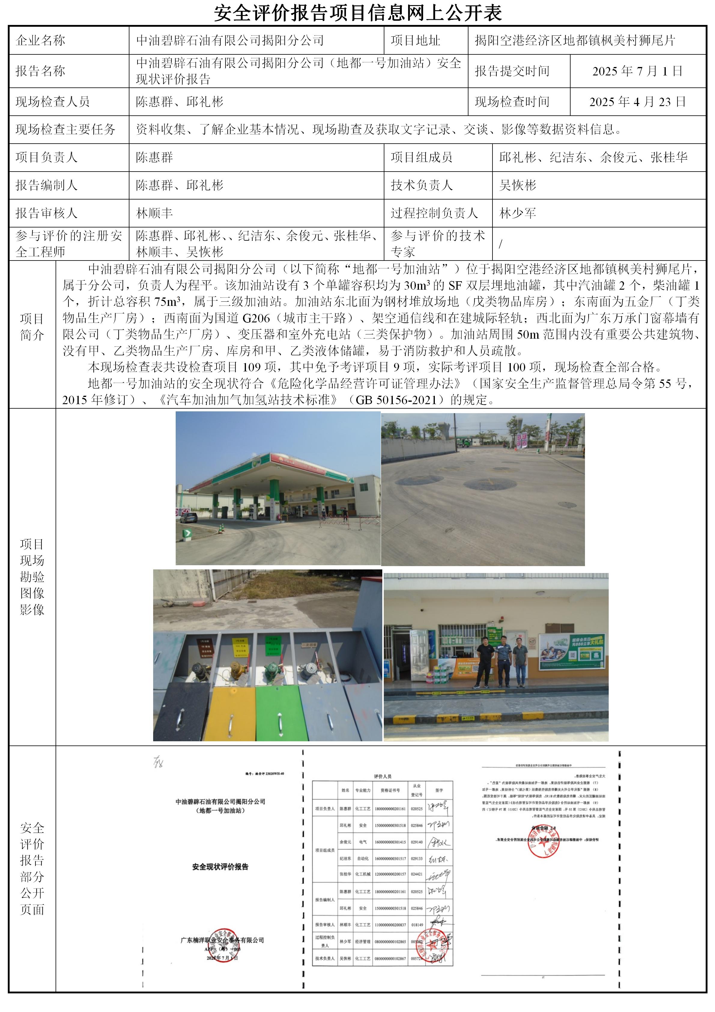 中油碧辟石油有限公司揭阳分公司(地都一号加油站)安全现状评价