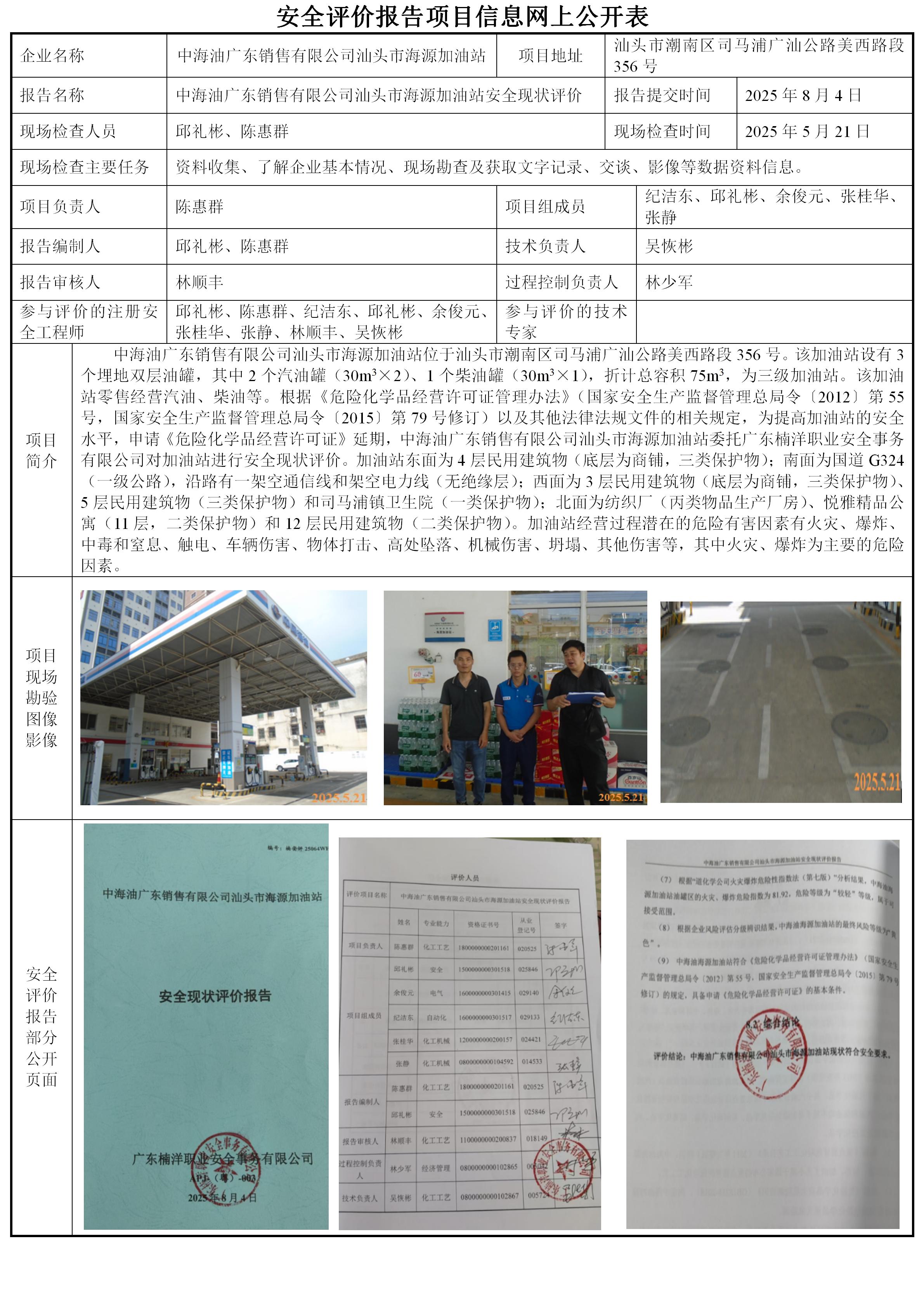 中海油广东销售有限公司汕头市海源加油站安全现状评价