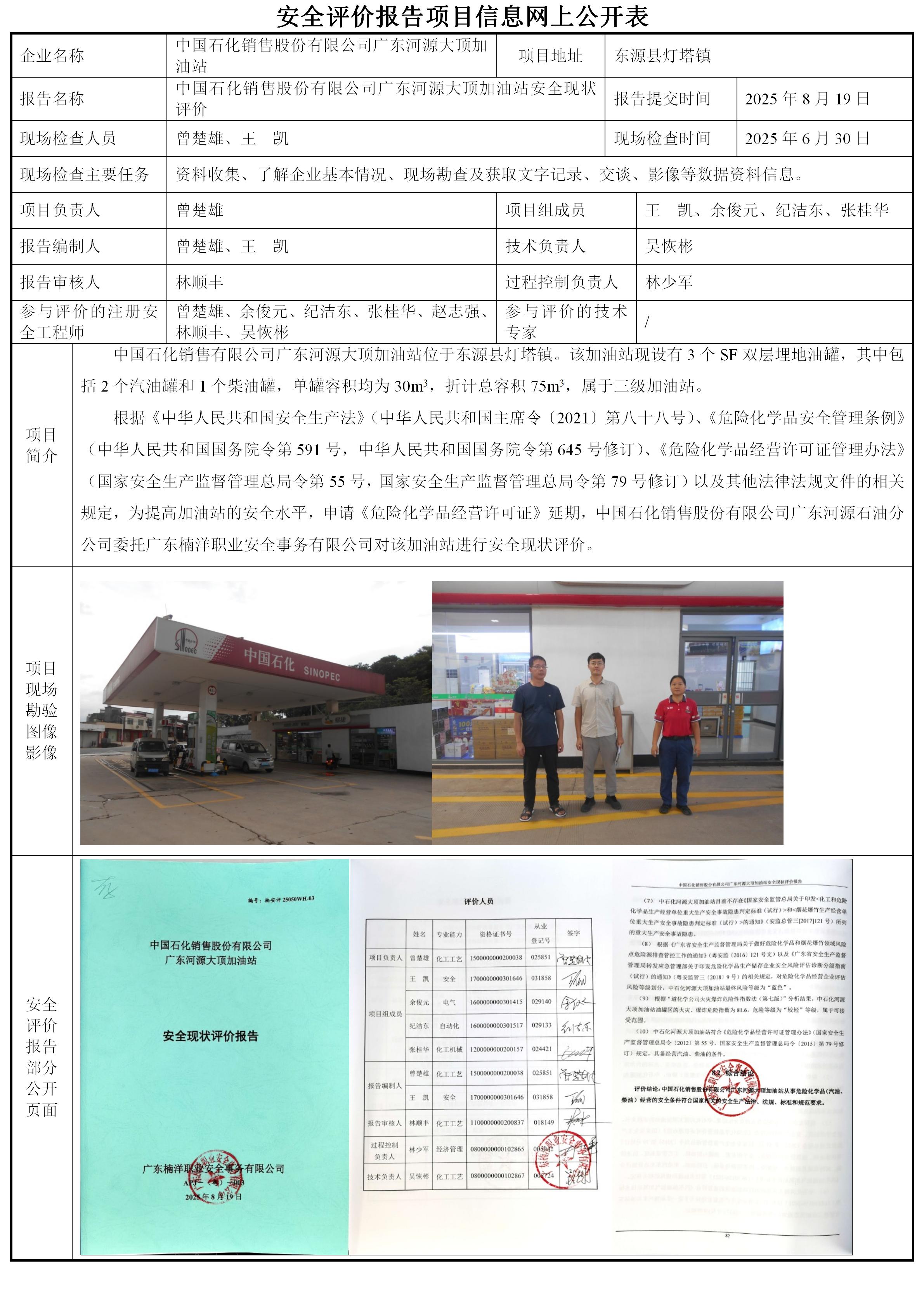 中国石化销售股份有限公司广东河源大顶加油站安全现状评价