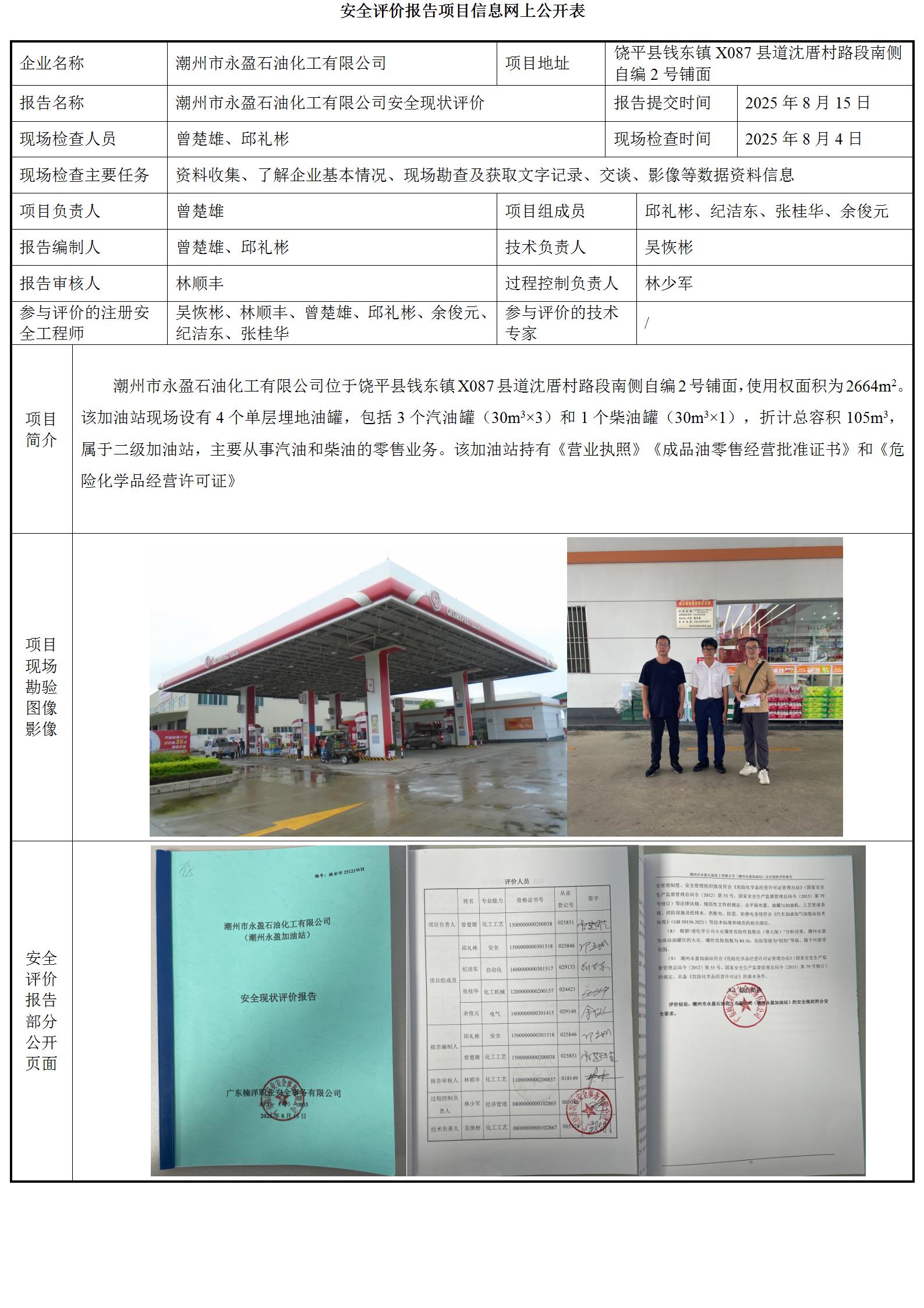 潮州市永盈石油化工有限公司(潮州永盈加油站)安全现状评价