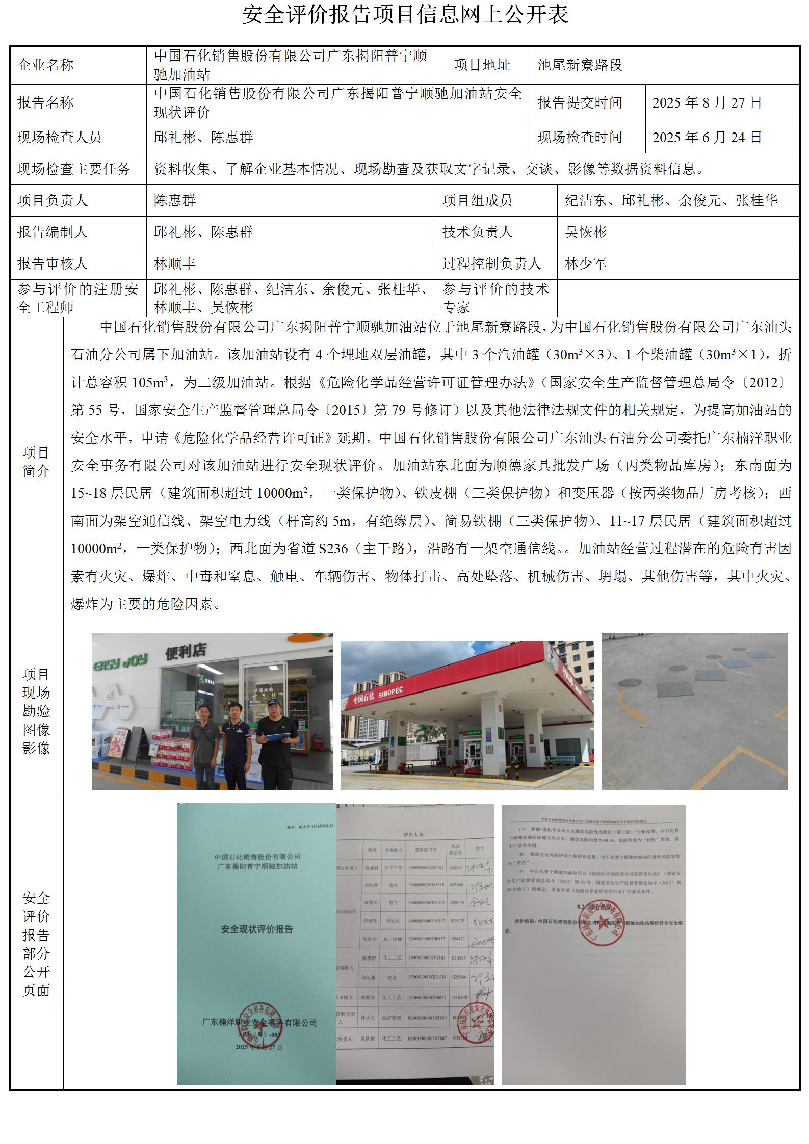 中国石化销售股份有限公司广东揭阳普宁顺驰加油站安全现状评价