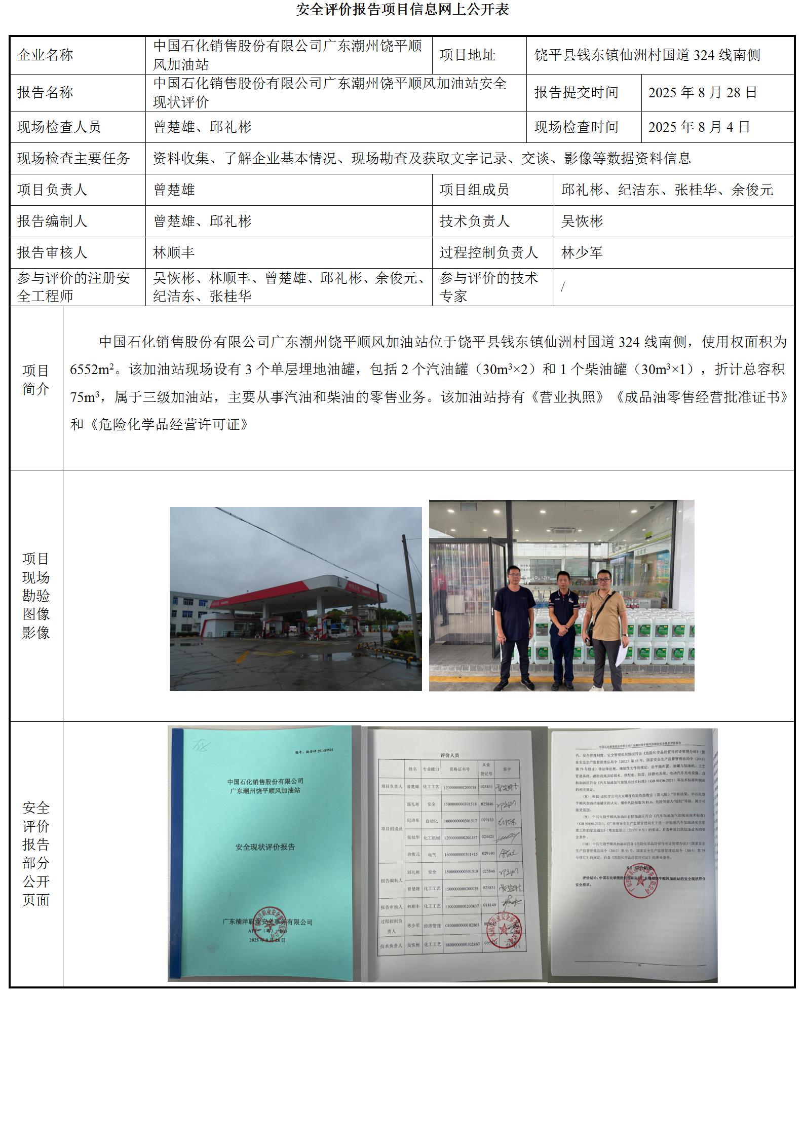中国石化销售股份有限公司广东潮州饶平顺风加油站安全现状评价