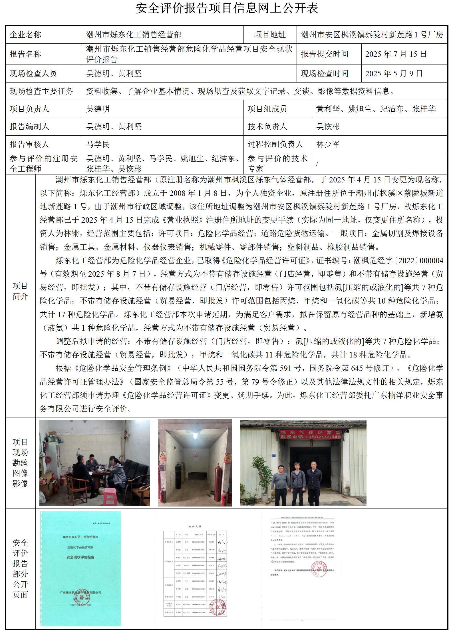 潮州市烁东化工销售经营部危险化学品经营项目安全现状评价