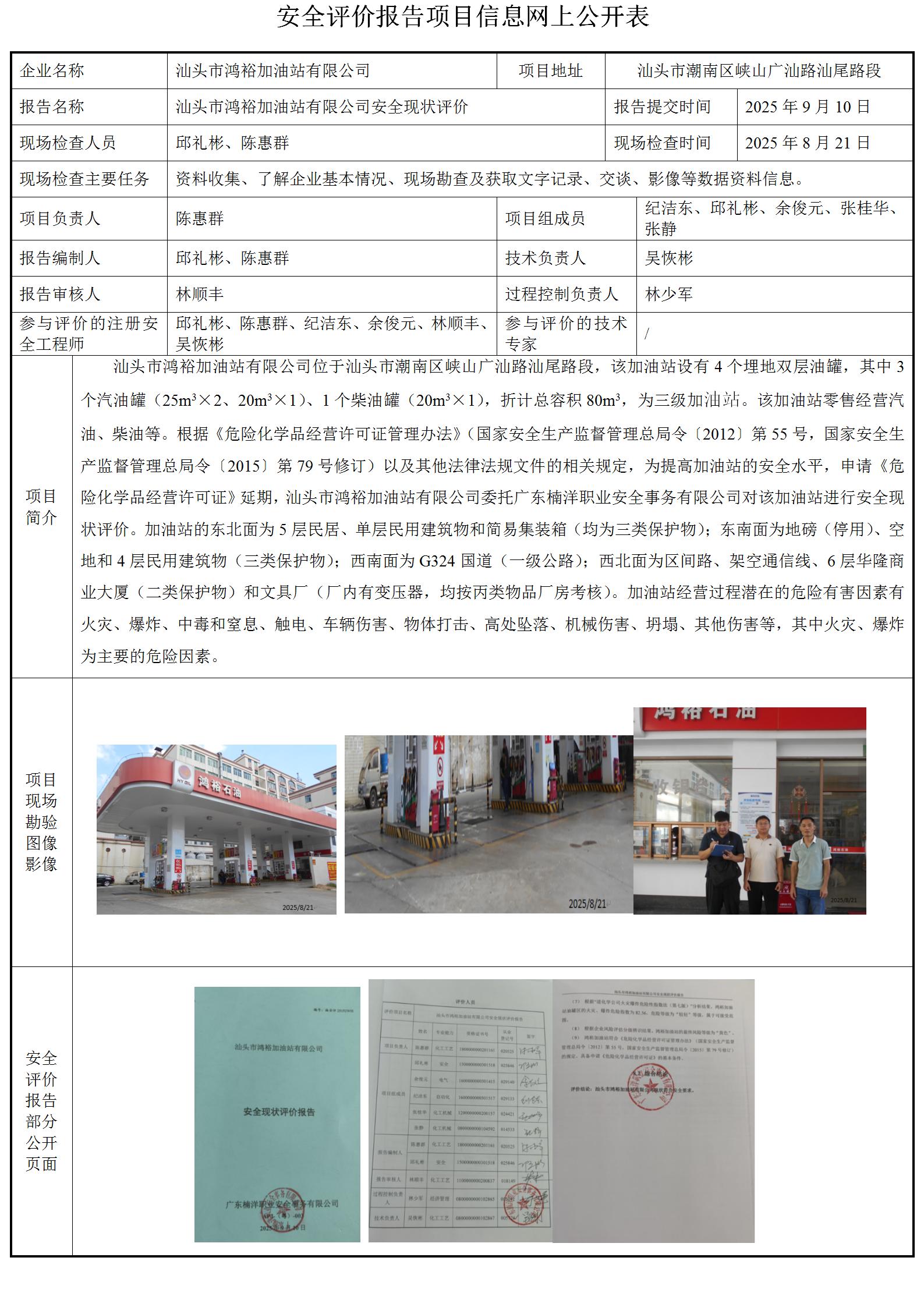 汕头市鸿裕加油站有限公司安全现状评价