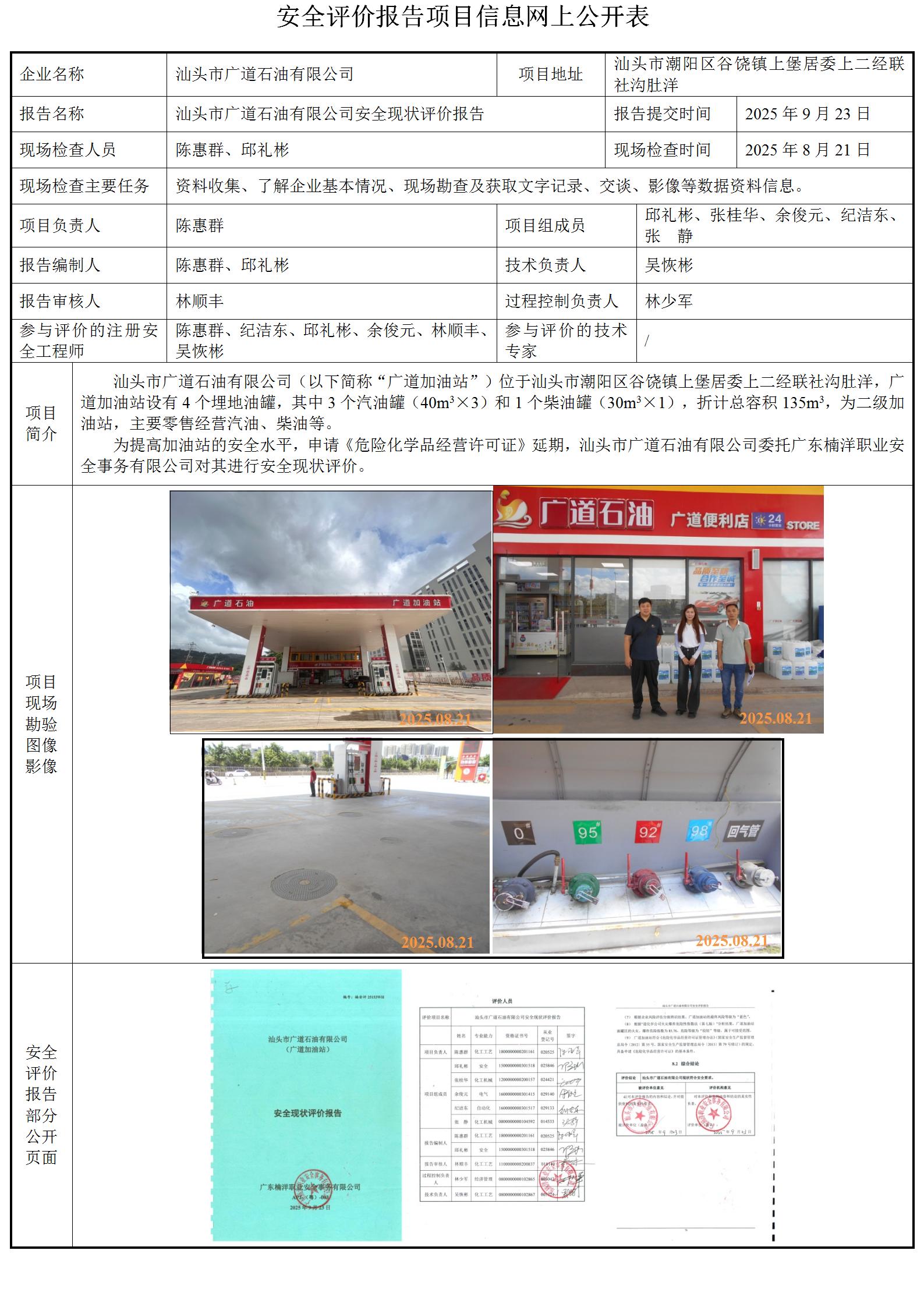 汕头市广道石油有限公司(广道加油站)安全现状评价