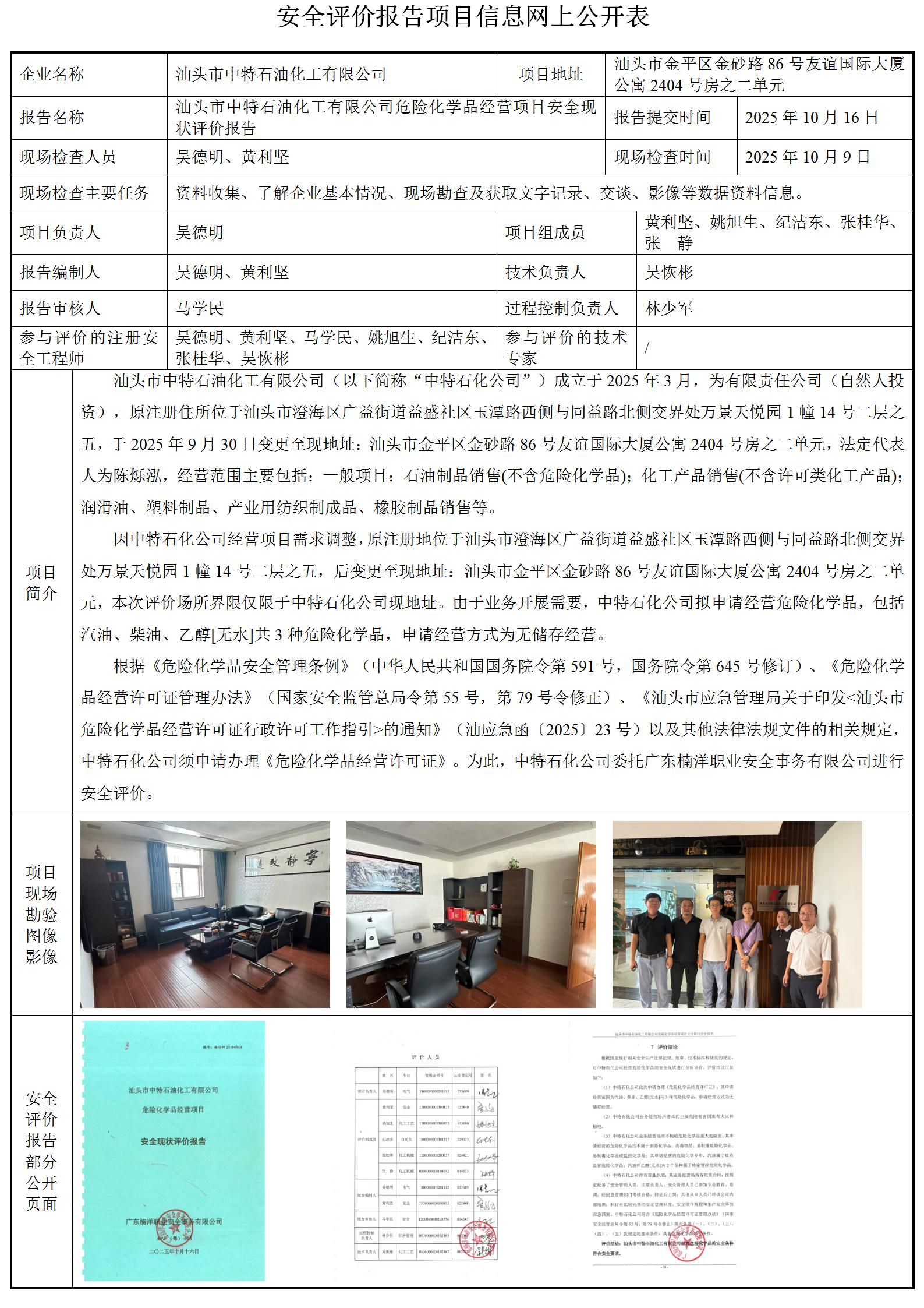 汕头市中特石油化工有限公司危险化学品经营项目安全现状评价