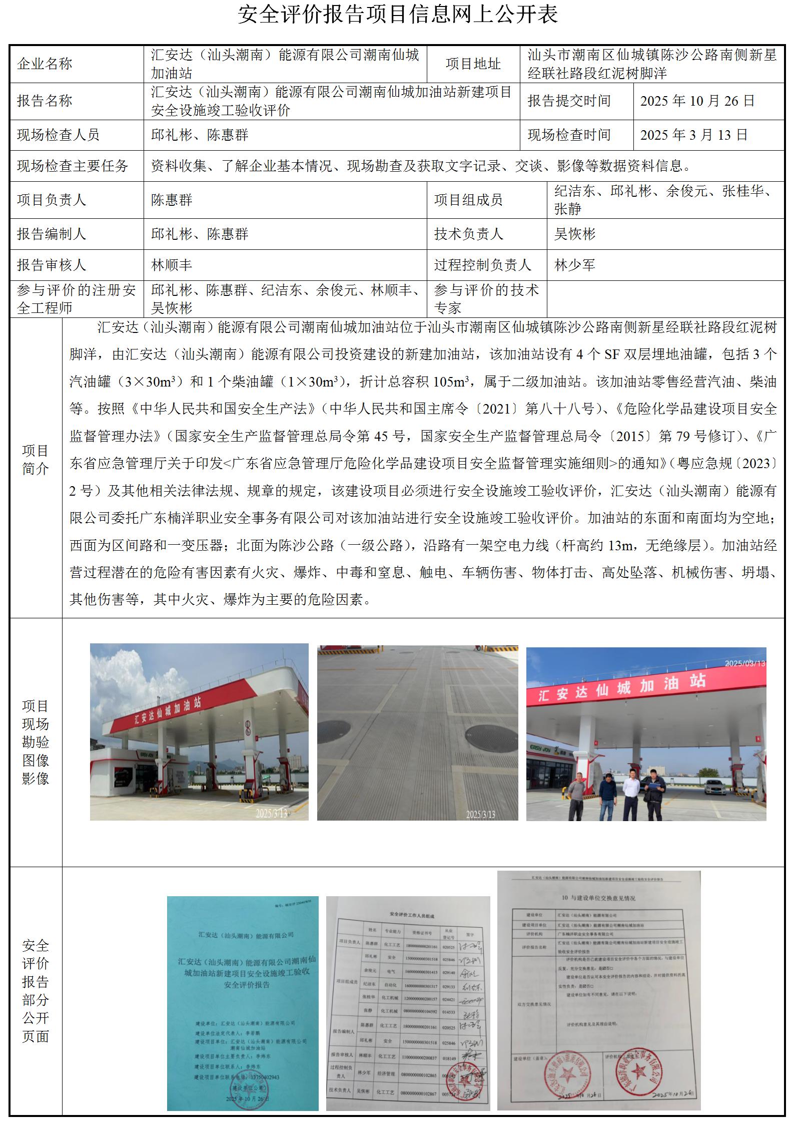 汇安达(汕头潮南)能源有限公司潮南仙城加油站新建项目安全设施竣工验收安全评价