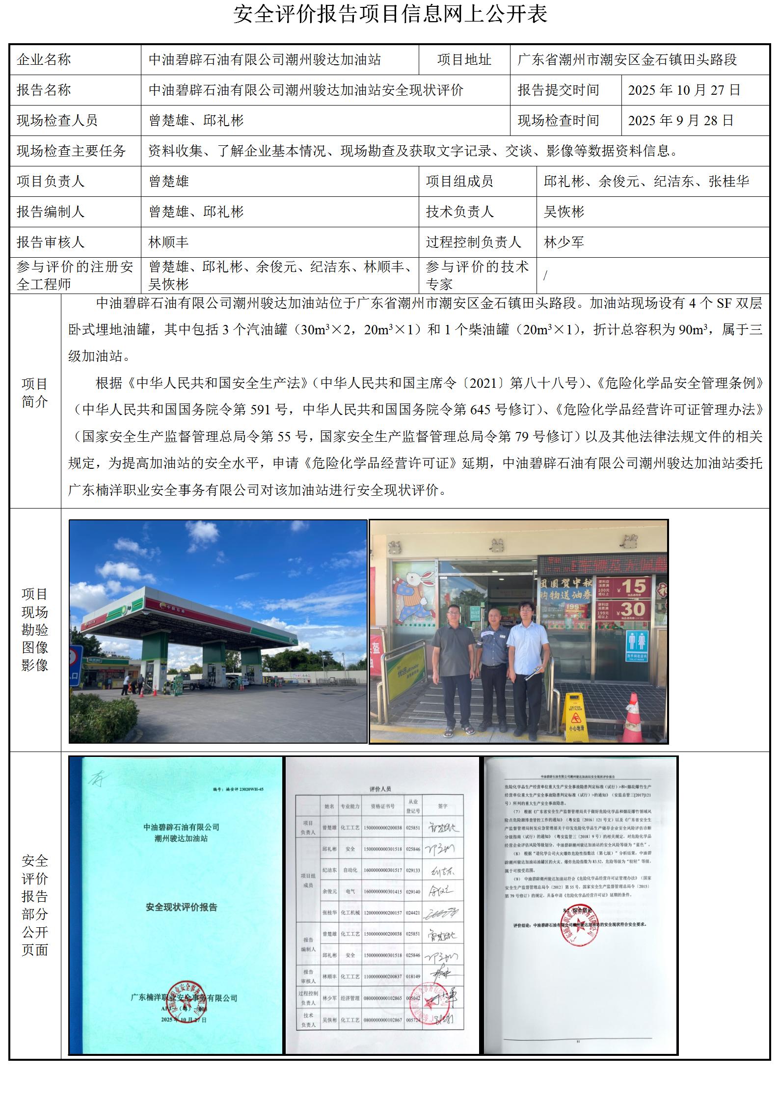 中油碧辟石油有限公司潮州骏达加油站安全现状评价