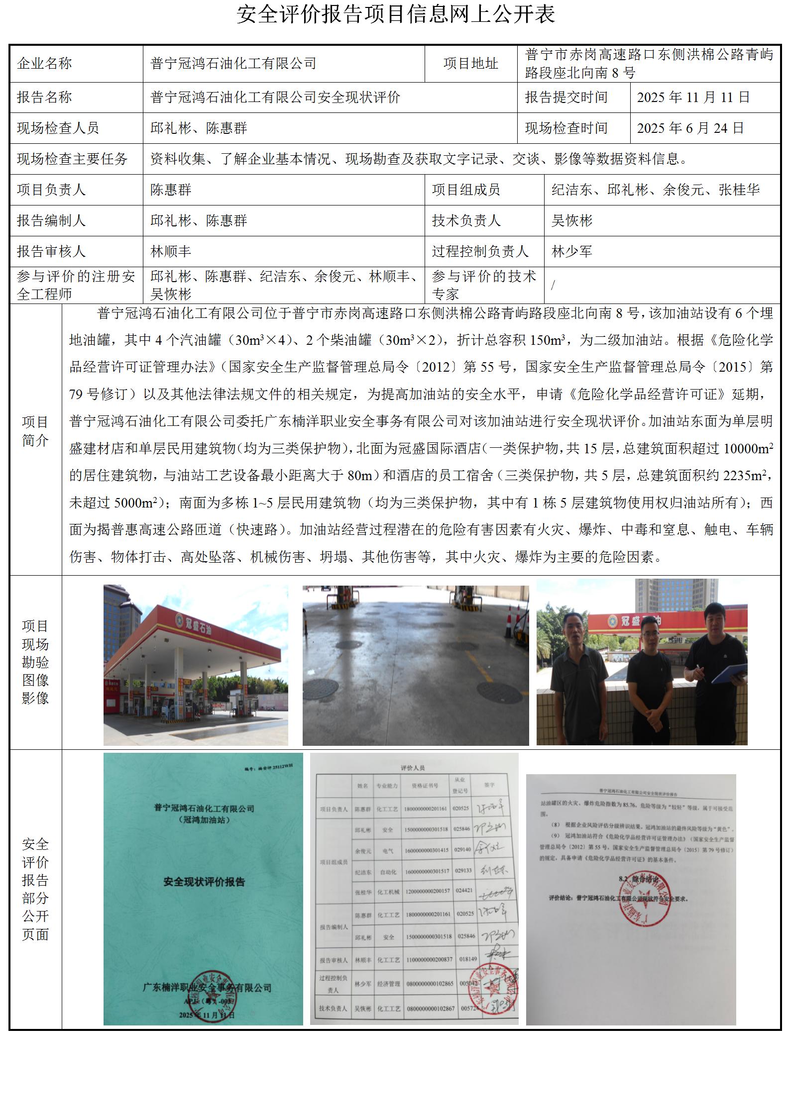 普宁冠鸿石油化工有限公司(冠鸿加油站)安全现状评价