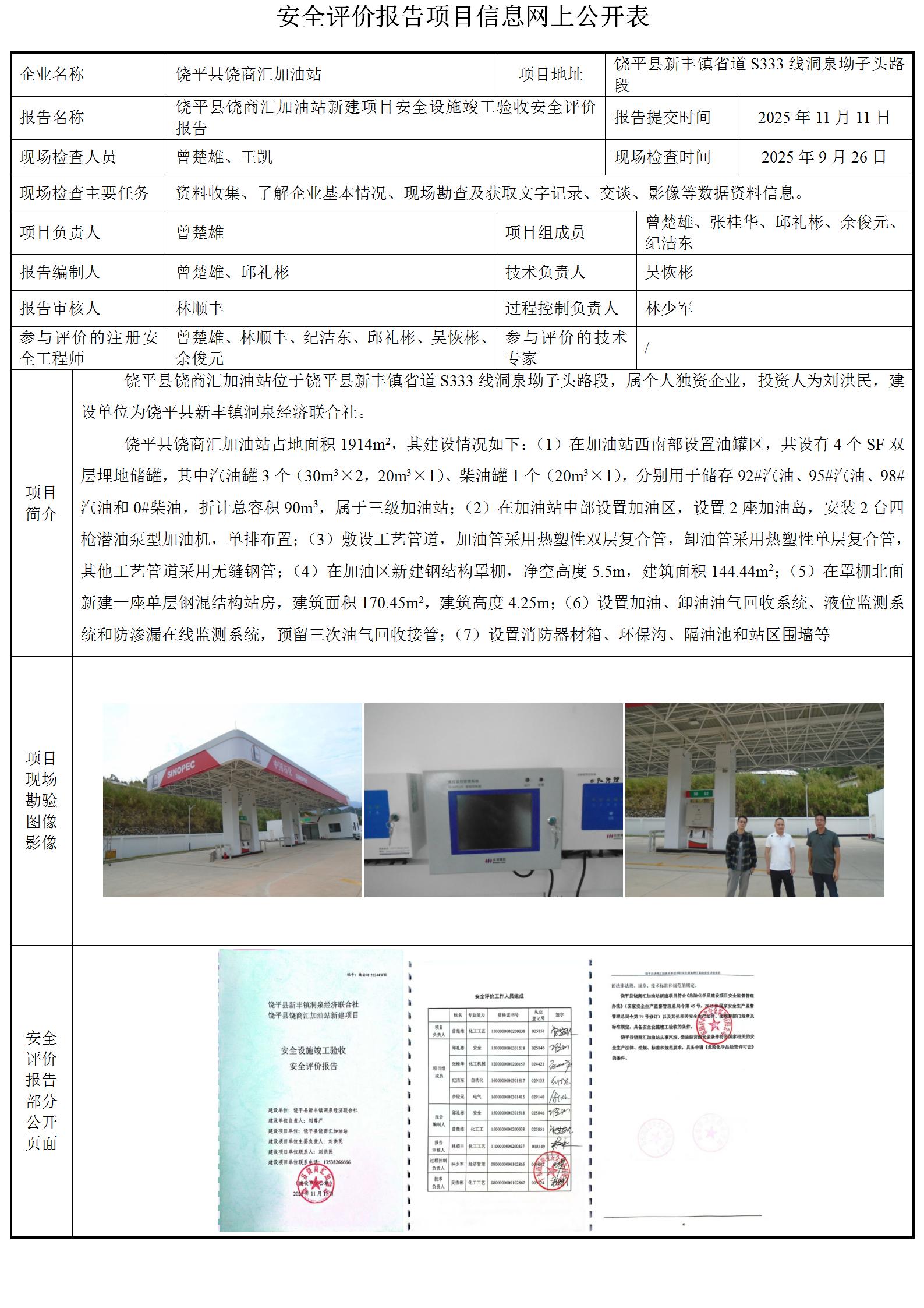 饶平县新丰镇洞泉经济联合社饶平县饶商汇加油站新建项目安全设施竣工验收安全评价