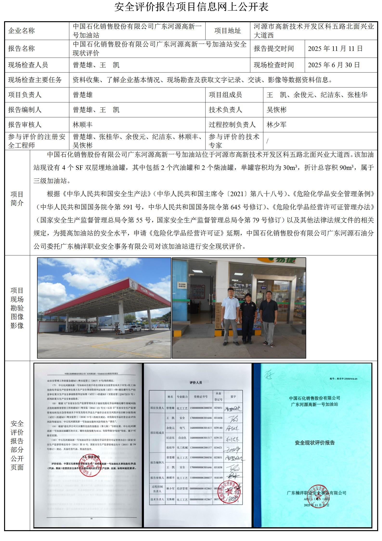 中国石化销售股份有限公司广东河源高新一号加油站安全现状评价