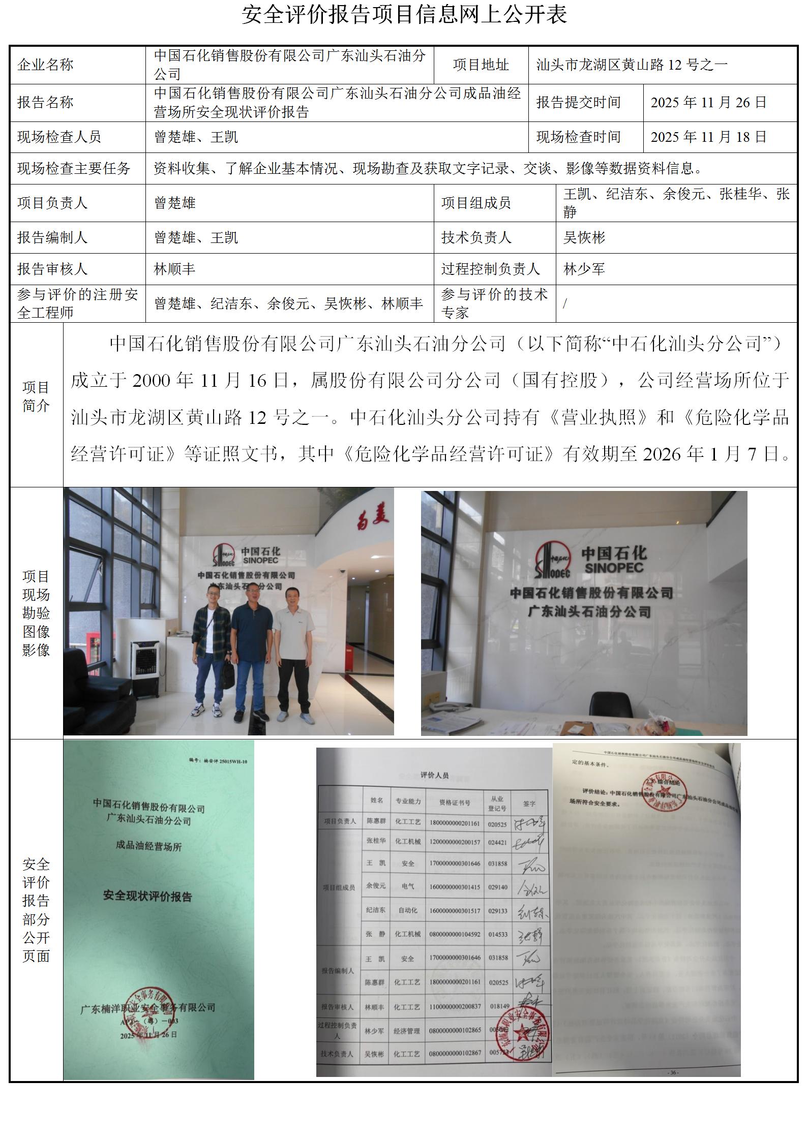 中国石化销售股份有限公司广东汕头石油分公司成品油经营场所安全现状评价