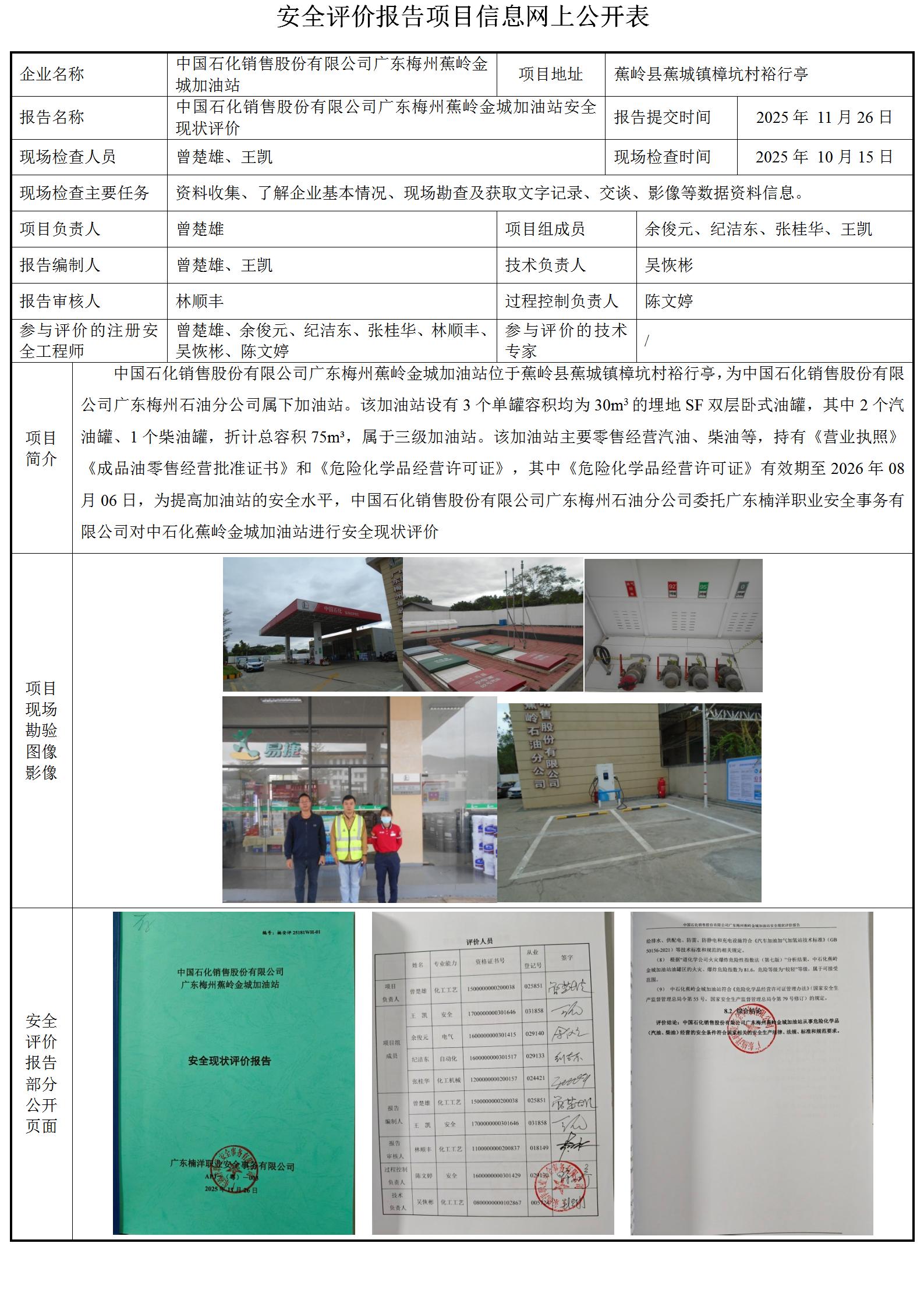 中国石化销售股份有限公司广东梅州蕉岭金城加油站安全现状评价