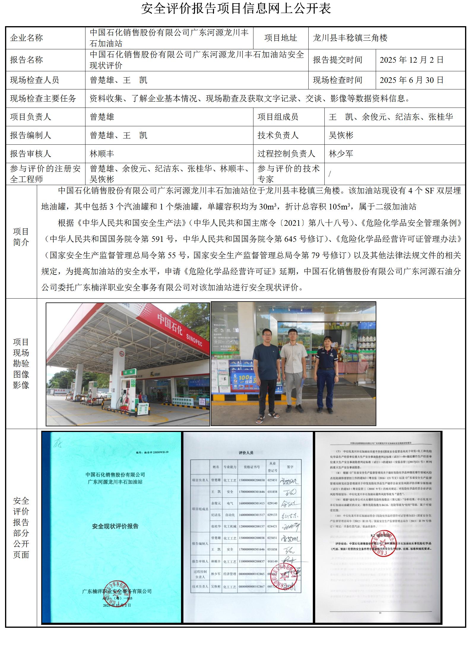 中国石化销售股份有限公司广东河源龙川丰石加油站安全现状评价