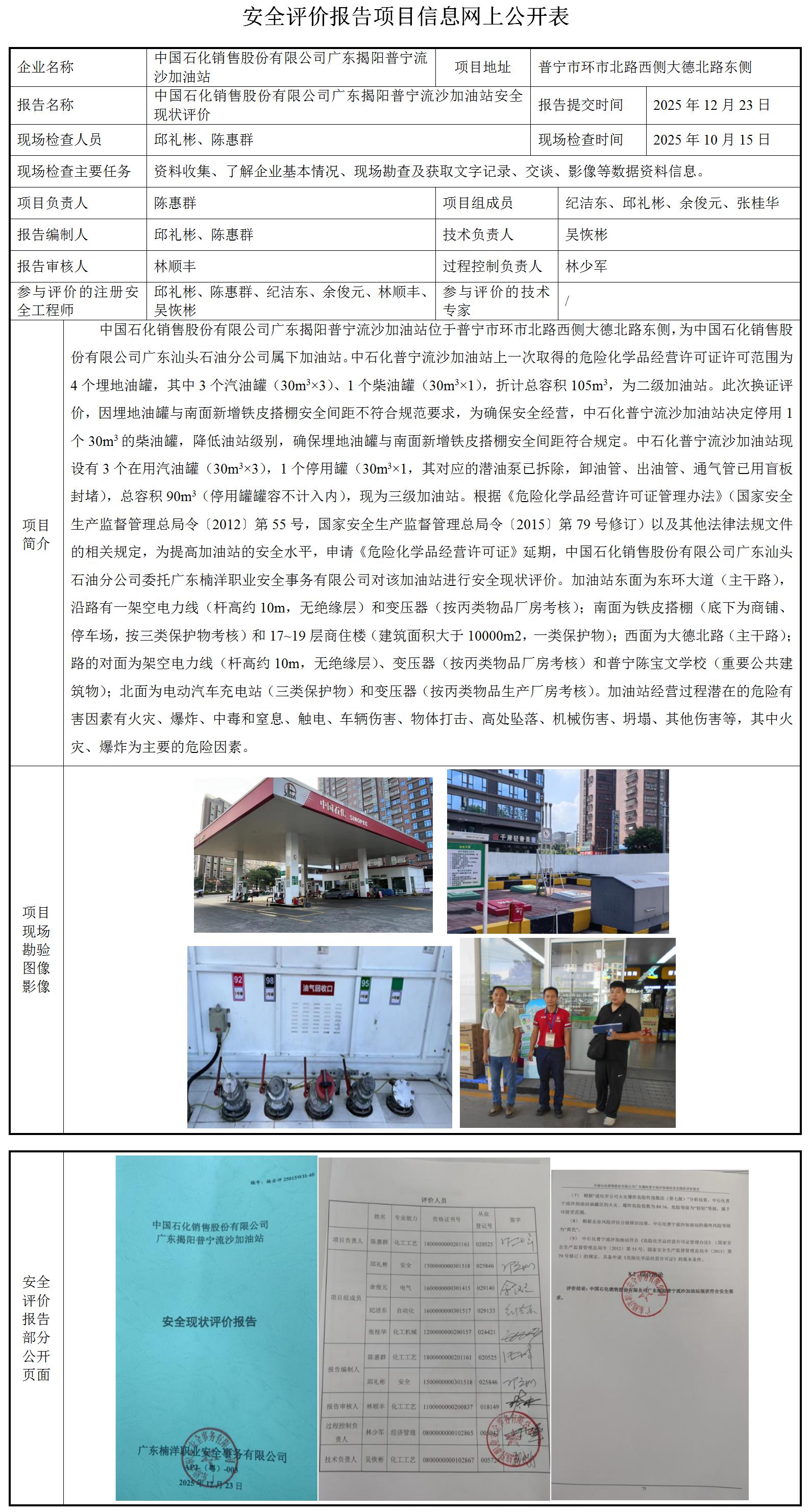 中国石化销售股份有限公司广东揭阳普宁流沙加油站安全现状评价