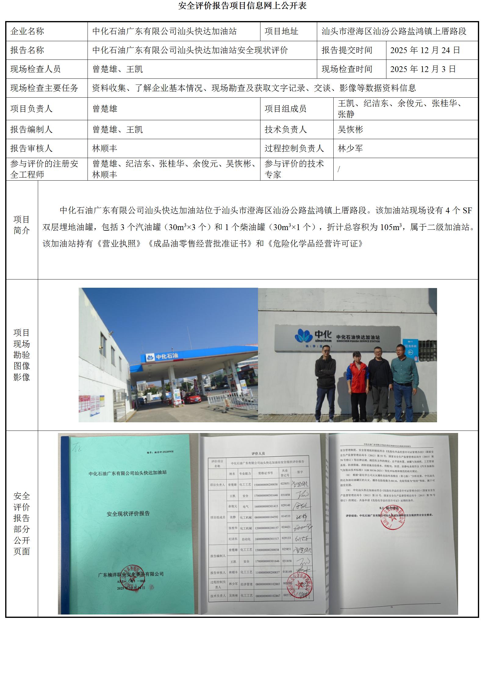 中化石油广东有限公司汕头快达加油站安全现状评价