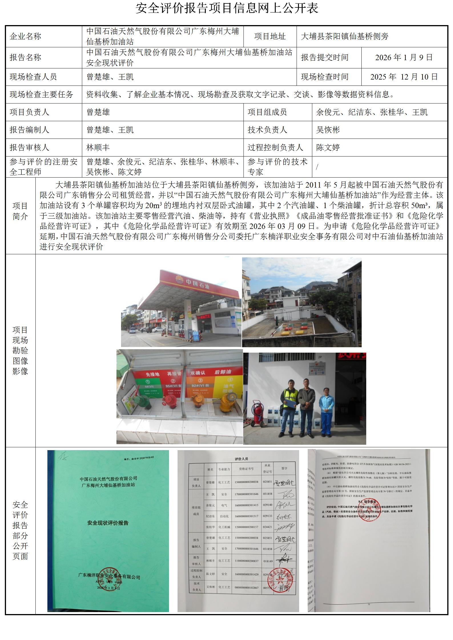 中国石油天然气股份有限公司广东梅州大埔仙基桥加油站安全现状评价