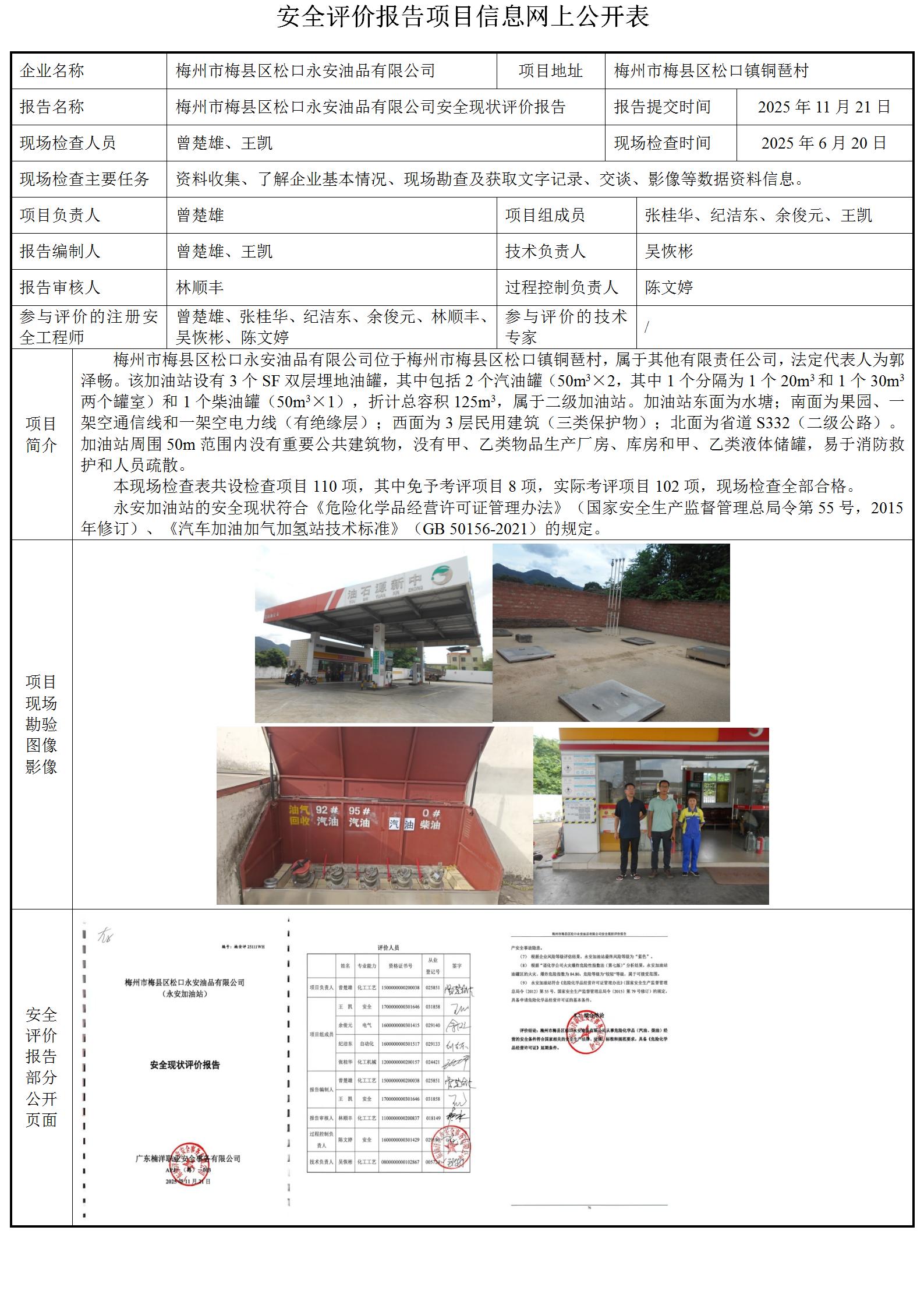 梅州市梅县区松口永安油品有限公司(永安加油站)安全现状评价