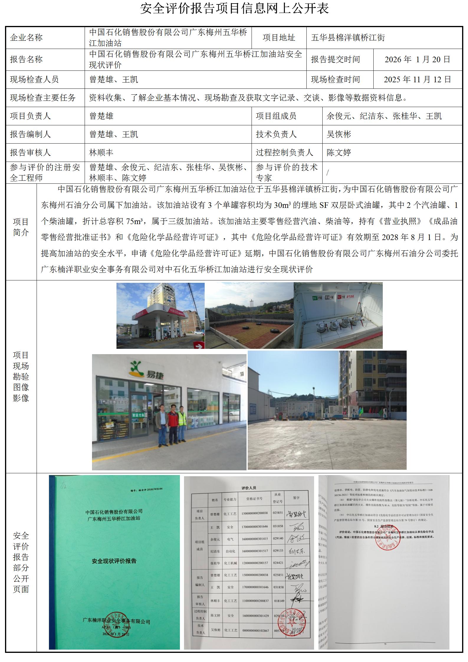 中国石化销售股份有限公司广东梅州五华桥江加油站安全现状评价
