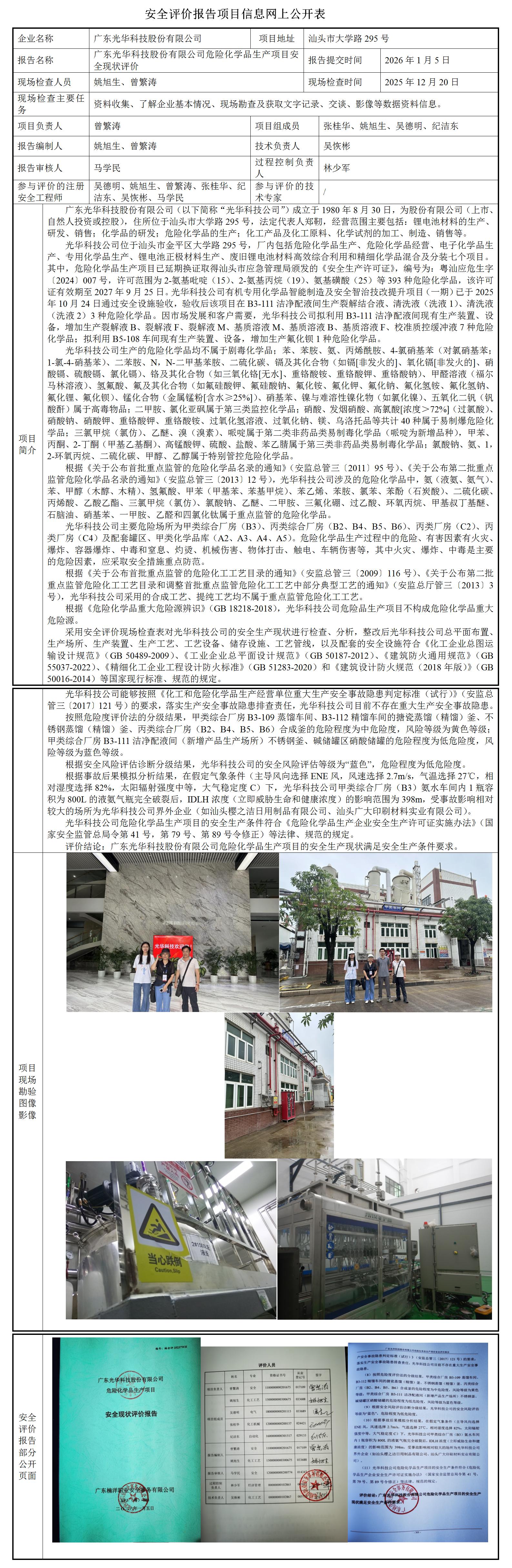 广东光华科技股份有限公司危险化学品生产项目安全现状评价