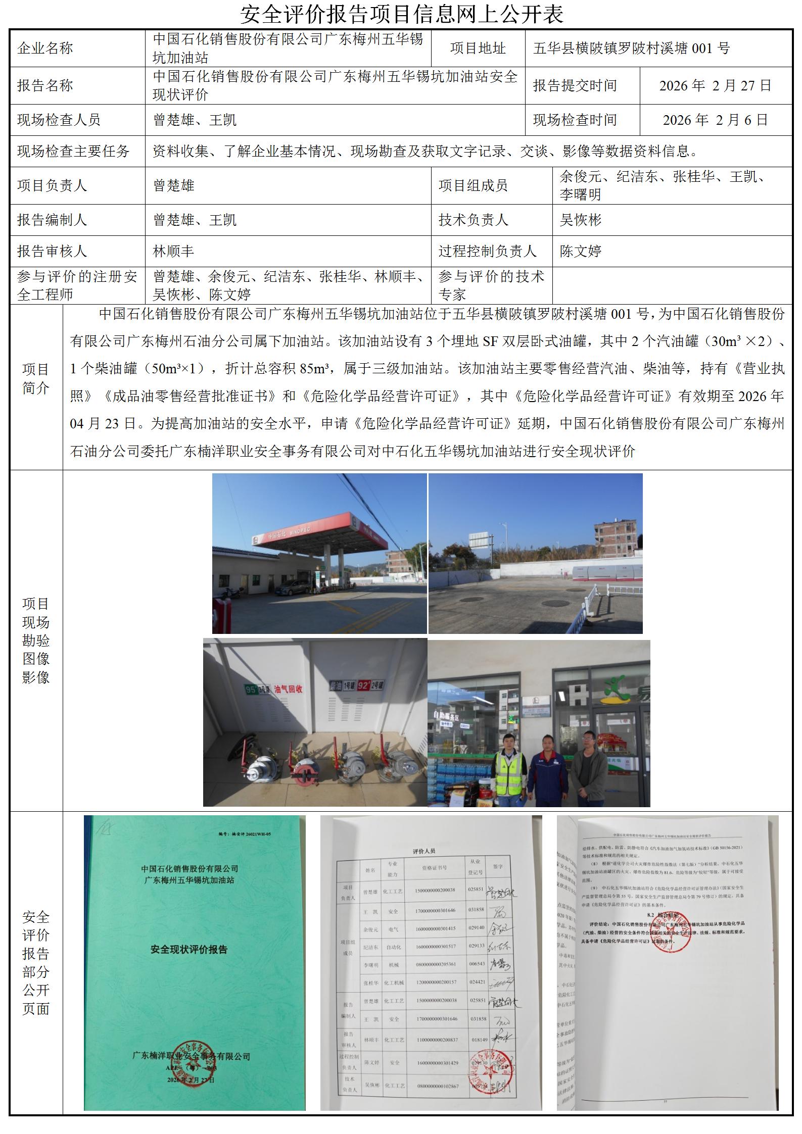 中国石化销售股份有限公司广东梅州五华锡坑加油站安全现状评价